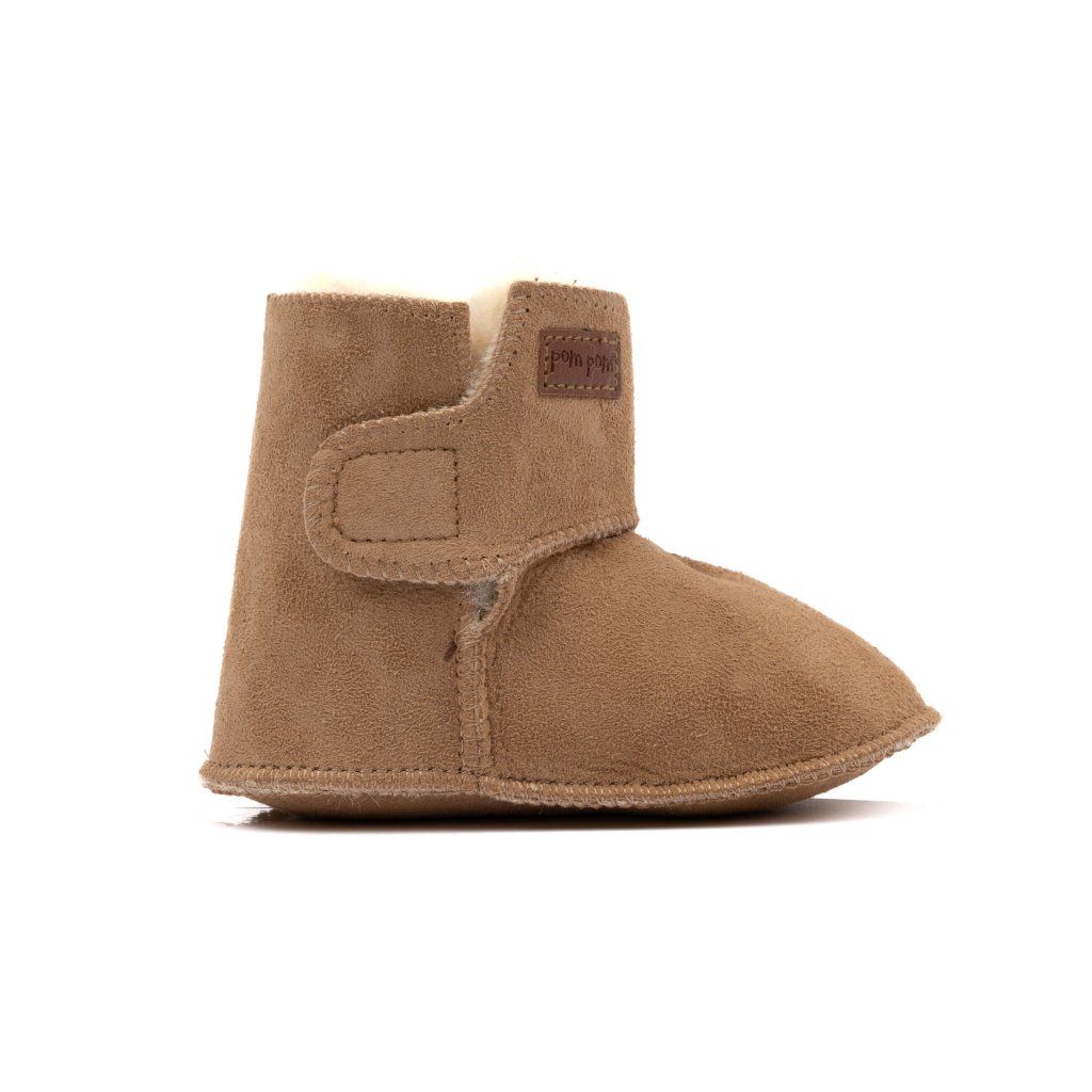 Dětské teplé kožené capáčky Booty™ Sheepskin hnědé Camel POM POM