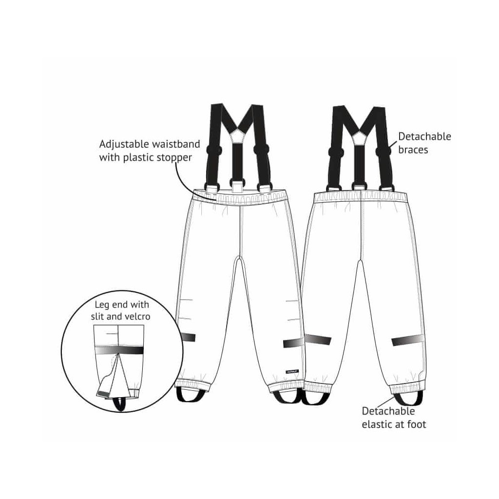Pro maximální pohodlí a flexibilitu mají kalhoty několik praktických detailů. Odepínatelné šle zajišťují, že kalhoty drží tam, kde mají, a zároveň se dají snadno sundat. Nastavitelný pas s plastovou brzdičkou umožňuje kalhoty přizpůsobit postavě dítěte. Od velikosti 98 výše mají kalhoty také nastavitelný konec nohavic se suchým zipem, který zjednodušuje navlékání přes boty a zabraňuje vniknutí sněhu. Odepínatelné elastické pásky pod nohy udržují nohavice na místě, aby se nevyhrnovaly ani při aktivní hře.